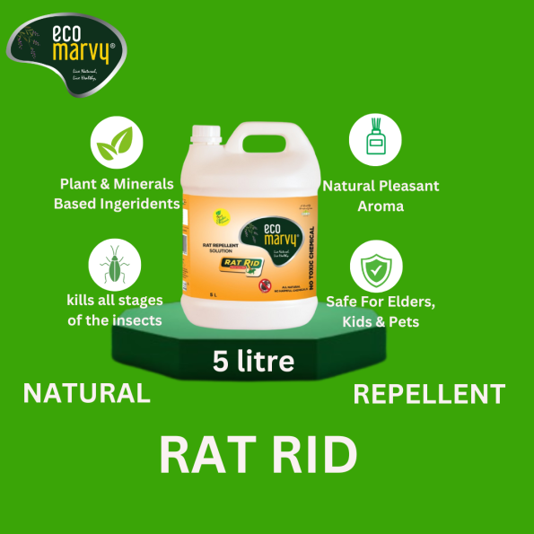 EcoMarvy has introduced a 5 Litre Best Rat Repellent called RAT RID, the most effective repellent formulation with natural ingredients, a ready-to-use spray to eradicate the disruption caused by rats. As it is the Natural rat repellent & anti-rat spray in India and contains only natural ingredients & zero chemical agents, efficient for gardens, agriculture fields & plot areas.